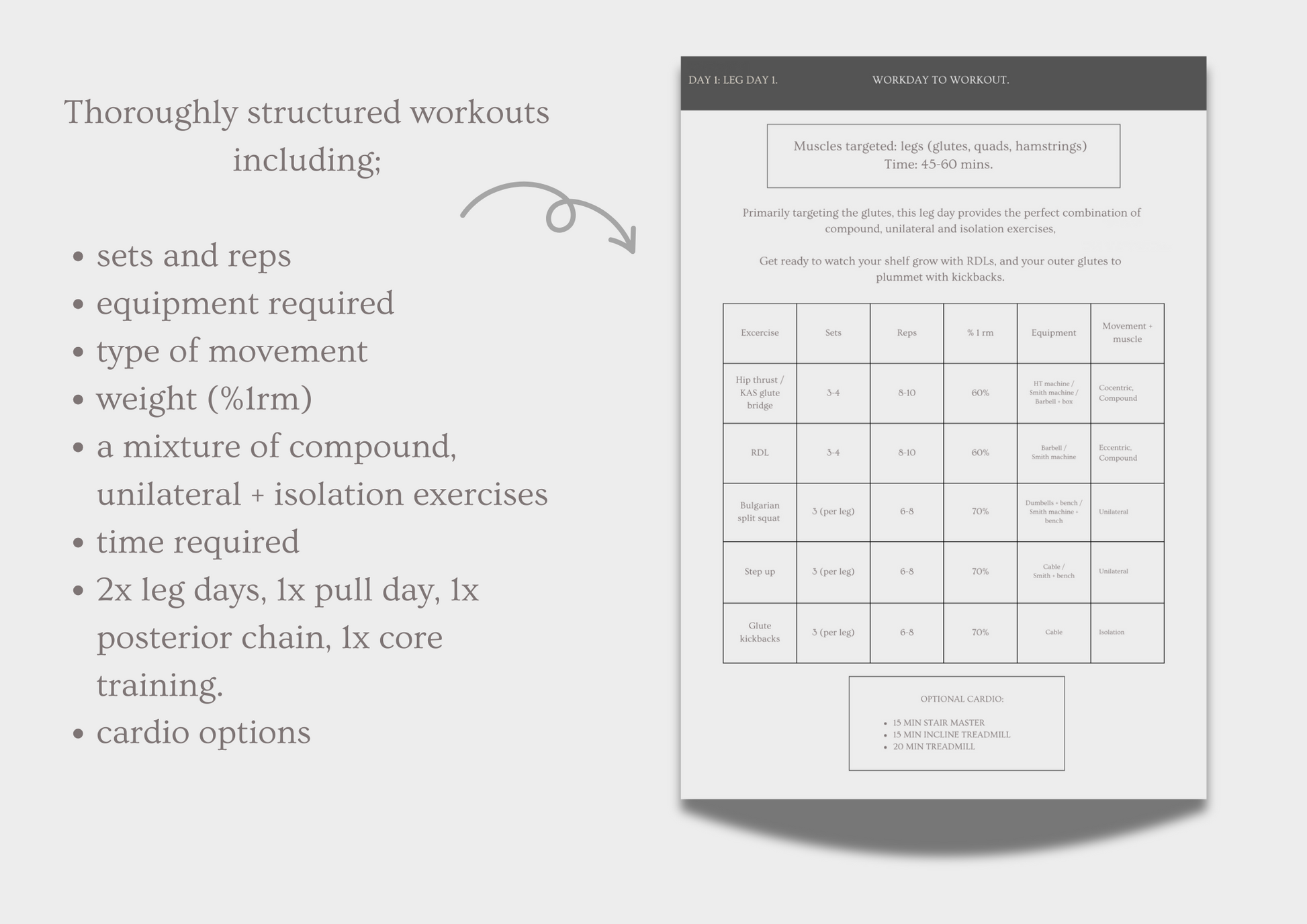 Designed for the busy 9-5 girlies, this 5-day / 8-week rotation workout plan will help sculpt your glutes, tone your back, and slim your waist; without exceeding a 60 minute workout.