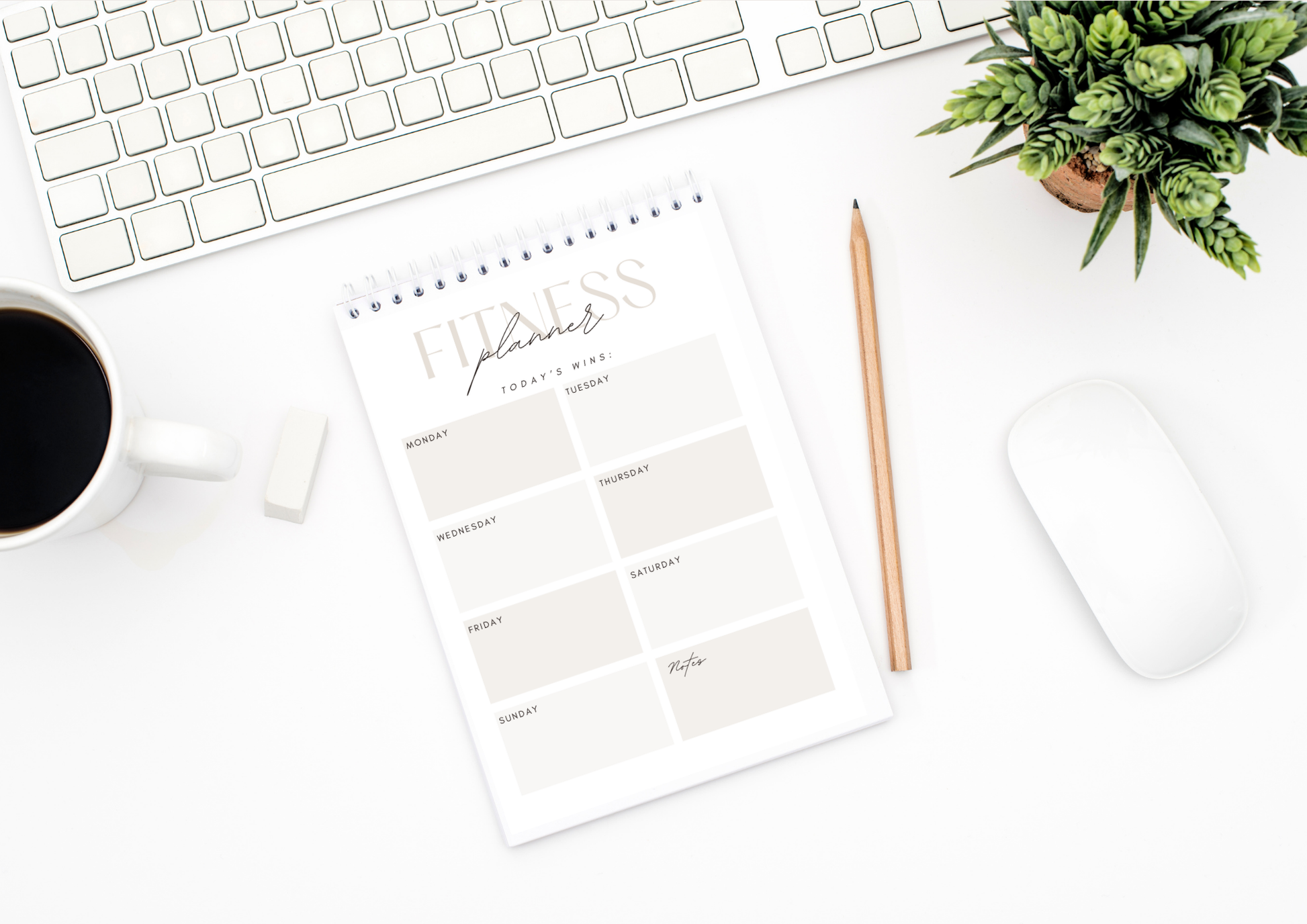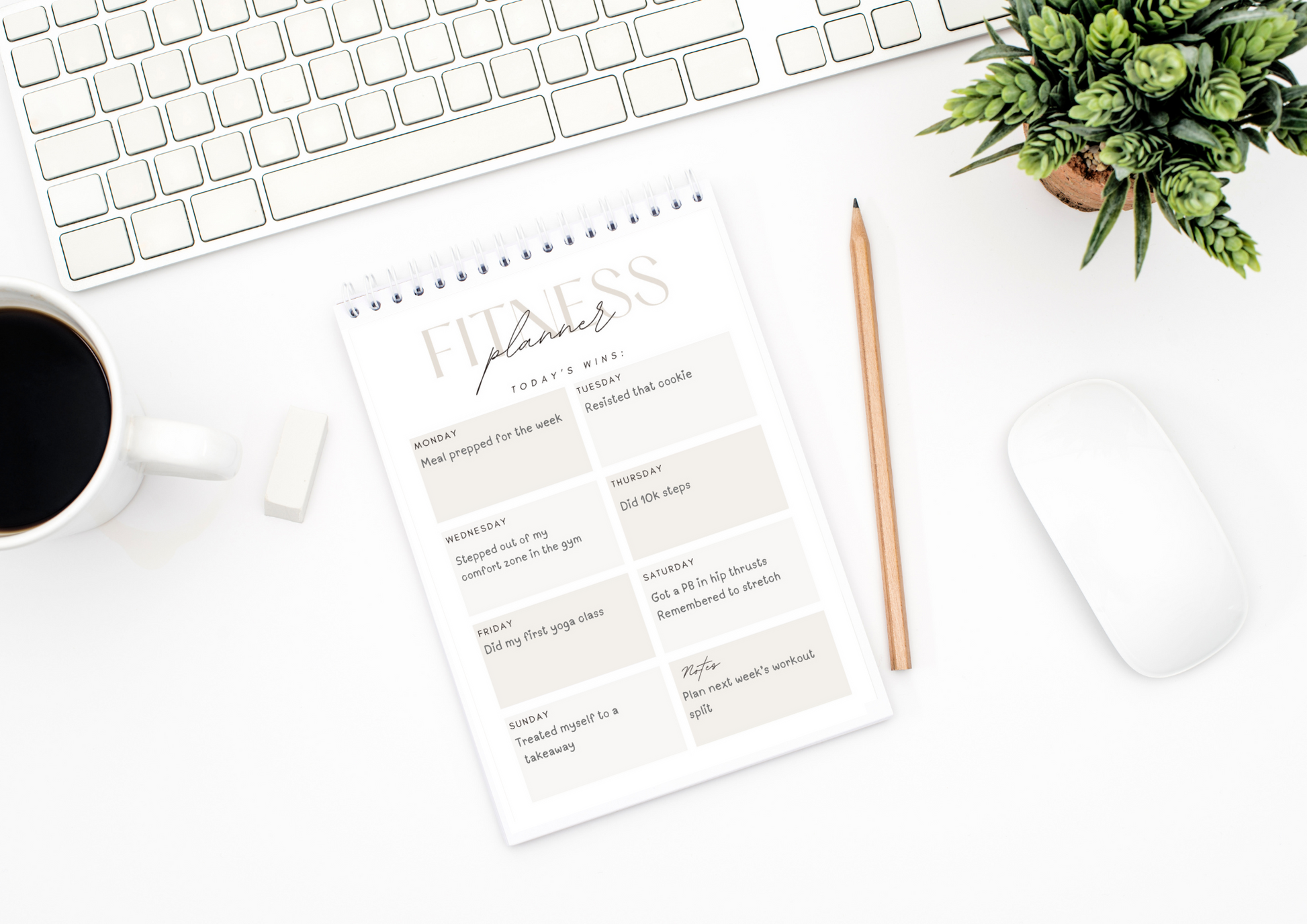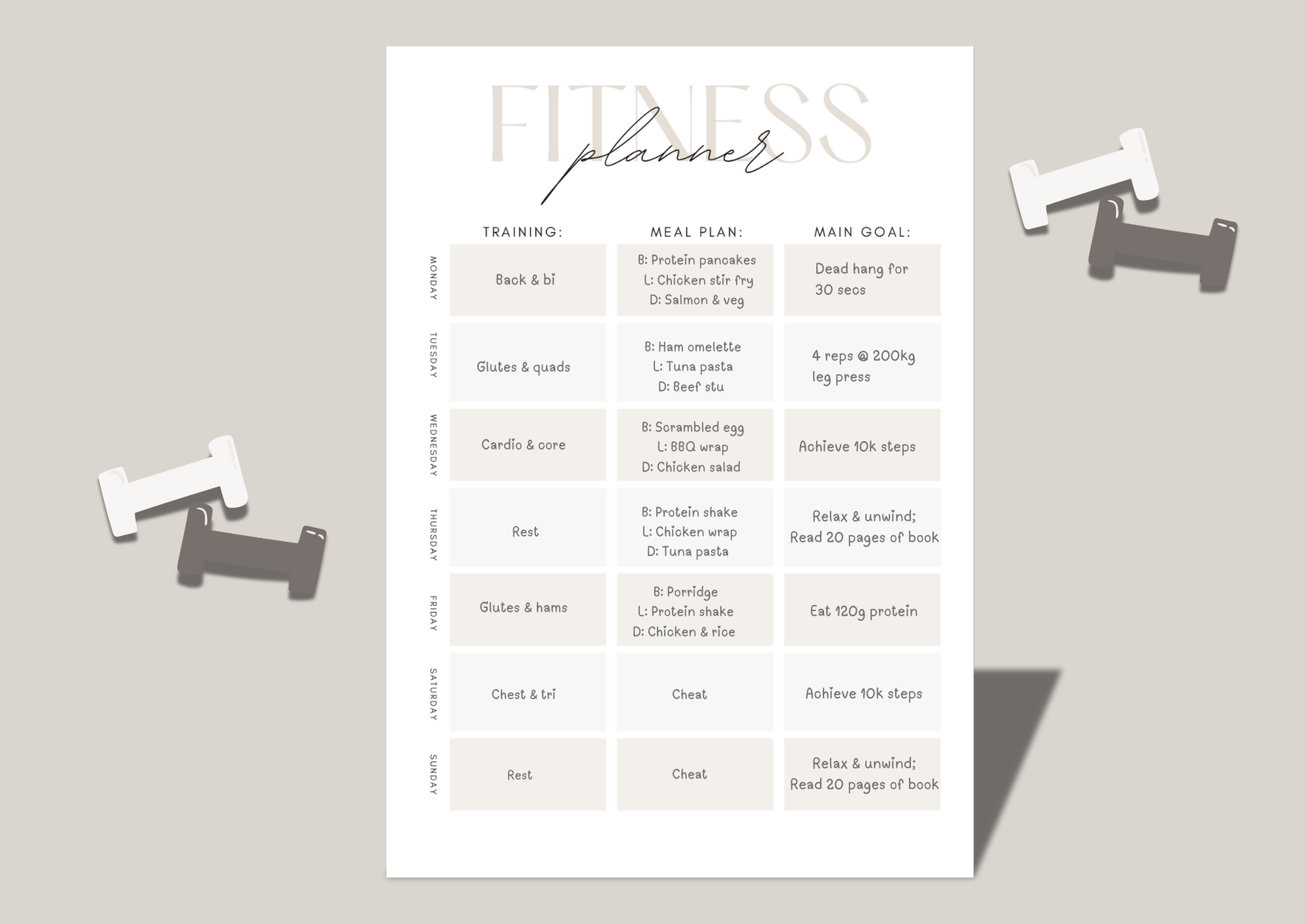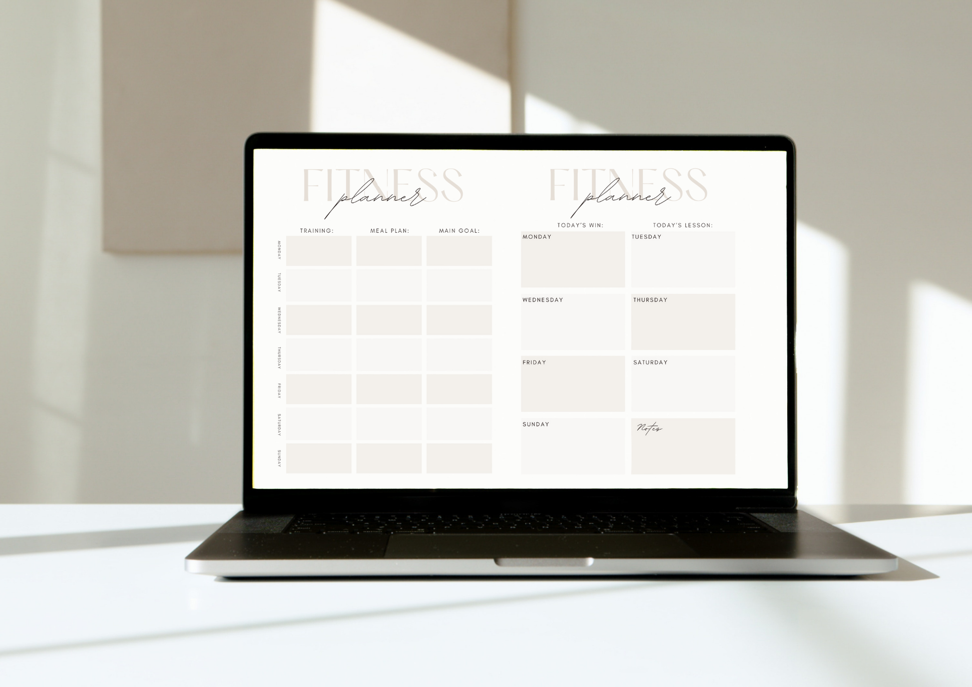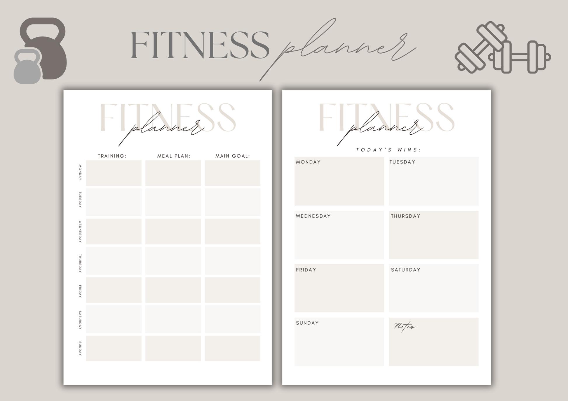 Use this two-page digital fitness planner to track your workouts, plan your meals and organise your goals!